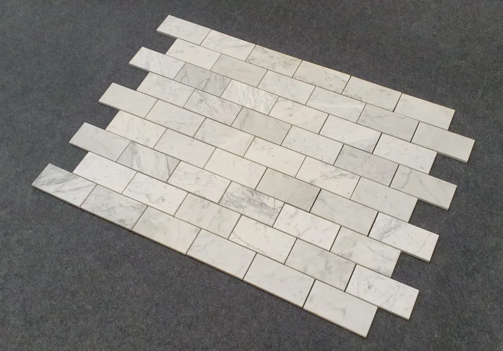 Mozaika wykonana z naturalnego marmuru Bianco Carrara w klasycznym układzie bricks. Matowe wykończenie podkreśla subtelną, elegancką strukturę kamienia oraz jego naturalne, jasnoszare użylenie. Idealna do zastosowań wewnętrznych — na ścianach w łazienkach, kuchniach, salonach oraz w aranżacjach dekoracyjnych. Świetnie sprawdza się zarówno w nowoczesnych, jak i klasycznych wnętrzach. Wymiar mozaiki 15x7x1cm.